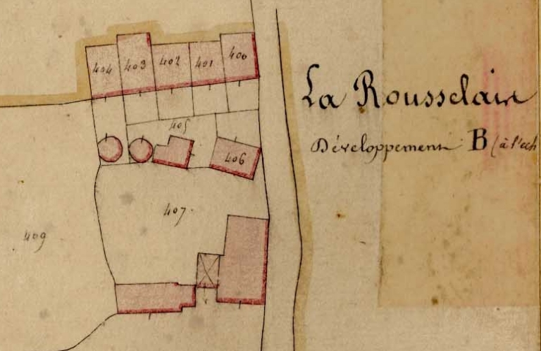 Section H dite de La Rousselais en 3 feuilles, 2ème feuille, du n° 51 au n° 841. Gaboriaud, géomètre du cadastre, [1850], échelle 1/2000 e. (A.D. Ille-et-Vilaine).