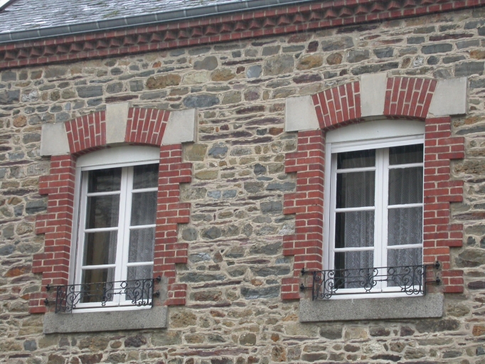 Cette maison est élevée en moellon de schiste. Les ouvertures ont des encadrements en brique, des clés en tufeau et des appuis en granite. A l'étage, les fenêtres ont des gardes-corps en fer forgé. Les chaînages d'angle et la corniche en façade sont en brique. La corniche est en bois sur les pignons.