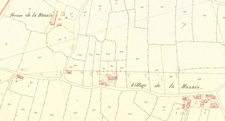 L'écart de la Hazais se compose d'une ferme assez importante la ferme de la Hazais, d'une habitation et du village de la Hazais. En 1850, l'écart comprenait quatorze logis dont certains sont réunis aujourd'hui pour former une seule habitation. Sur les six fours de 1850, seulement un est resté en place. Celui de la ferme de la Hazais est une construction plus récente. Nous pouvons distinguer trois types de logis : - ceux entièrement édifiés en schiste ardoisier - ceux ayant seulement la façade en schiste ardoisier ou avec en partie haute de la terre - ceux de petites dimensions avec des dépendances en terre avec leur solin en schiste ardoisier.