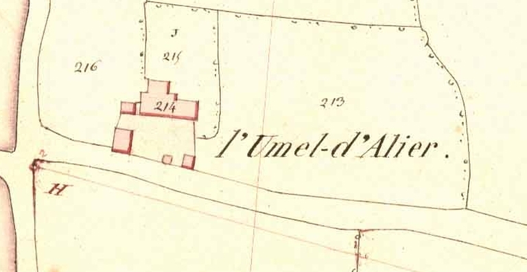Le lieu-dit Umel d'Alier, situé au sud-est du bourg, a été absorbé par ce dernier lors de son agrandissement après les années 1950. Deux pièces à feu accolées et ayant gardées leurs ouvertures d'origine se situent dans la partie ouest du bâtiment principal. Elles datent de la fin du 17e début 18e siècles. La partie Est est peut-être une ancienne étable et la dépendance au sud une écurie. Les dépendances ont été construites pendant la première moitié du 19e siècle. Sur le cadastre napoléonien de 1850, une seule famille habitait dans cette ferme. Le logis possédait une dépendance sur l'arrière. Un four existait près de la dépendance au sud.