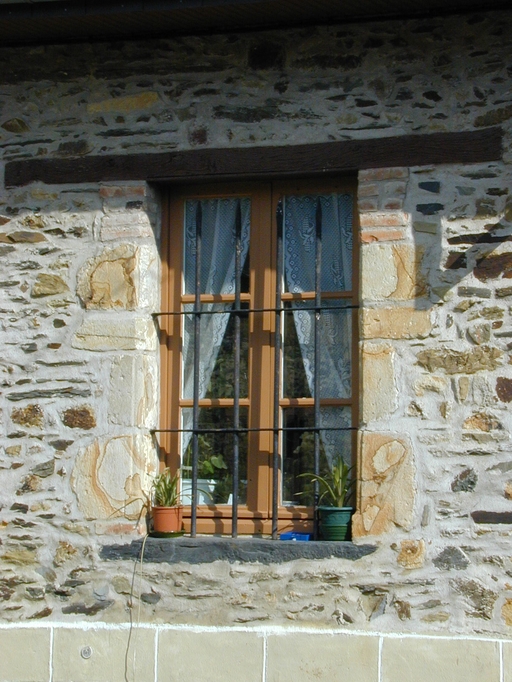 Le logis est en schiste avec les ouvertures d'origine en grès et celles remaniées en brique. Les dépendances sont en schiste et en terre.
