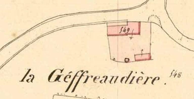 L'écart de la Géffreaudière était composé de cette ferme et d'une maison au n°7 route de Tayée. Cet écart proche du bourg a été absorbé par le village lors de son agrandissement après les années 1950. Cette ancienne ferme a probablement été construite au 18e siècle. La fenêtre bouchée de la partie est de la longère fait penser à un ancien logis. Il est possible que le premier logis ait été à cet endroit. La construction d'un second, plus imposant tant par son volume et son toit en pavillon que par la qualité de ses ouvertures, a contribuée à transformer le premier en dépendance. Pendant la deuxième moitié du 19e siècle, le logis est agrandi. Il intègre une partie de la longère, comme le suggère la fenêtre en brique qui a été percée. A cette même époque, les ouvertures du logis sont remaniées et une seconde dépendance au sud-est de l'habitation est construite. D'ailleurs, sa mise en œuvre différente de celle de la première dépendance confirme ces deux périodes de construction.