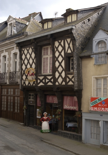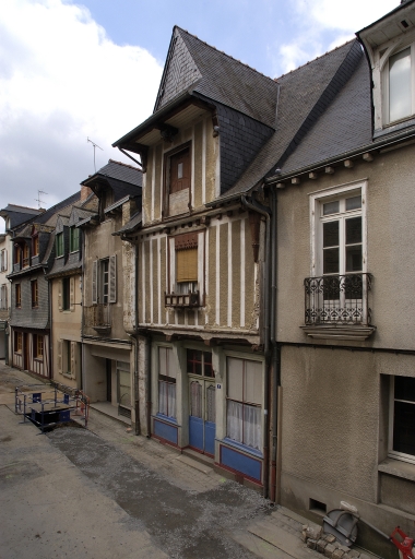 Le 19e siècle est comme partout ailleurs, une période de profonds remaniements et de nouvelles constructions. Si le centre ancien n´a pas été bouleversé dans son urbanisme, la plupart des anciennes maisons ont été néanmoins reprises à cette période. La construction en pan de bois semble abandonnée. Les logis qui se construisent après 1849, date de l´ancien cadastre sont en pierre. Ceux élevés autour des halles à partir de 1858 sont en moellons de schiste et de grès. Les encadrements des ouvertures sont en brique. Le parti uniforme des ces habitations s´intègre à un programme de rénovation du quartier, avec un cahier des charges défini. Les logis neufs qui bordent la rue de la Poterie présentent quant à eux des élévations plus variées. Le schiste seul est plus couramment utilisé avec des encadrements d´ouverture et des chaînages d´angle en brique. L´installation en 1864 d´une briqueterie à la Croix bénite, à l´Ouest de la ville, a inciter les maîtres d´oeuvre à utiliser ce matériau produit sur place. Quelques façades entièrement en brique crue ou émaillée sont élevées entre 1870 et 1880 dans la ruelle du Puits Rigault, actuellement rue Francis Guérault et dans le quartier du Bas-Noyal. (Figures 16 à 26)
