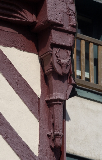 Dans l´encorbellement sur entretoises, le hourdis est remplacé par des pièces de bois ou entretoises. Plus qu´un simple remplissage, elles forment comme un étrésillon horizontal entre les solives pour les empêcher de se déplacer. L´entretoise est très souvent moulurée. En dehors, des guettes qui forment un décor simple, croix de Saint-André, losanges et feuilles de fougères, il existe peu de témoins d´éléments sculptés. Quelques consoles ou pigeâtes rendent compte d´un vocabulaire renaissant, bagues et feuilles d´acanthe. La maison du Grand Veneur, située 20 rue de la Madeleine fait figure d´exception avec sa tête de cerf sculptée en demi-relief sur une console de l´étage. (Figures 1 à 10)