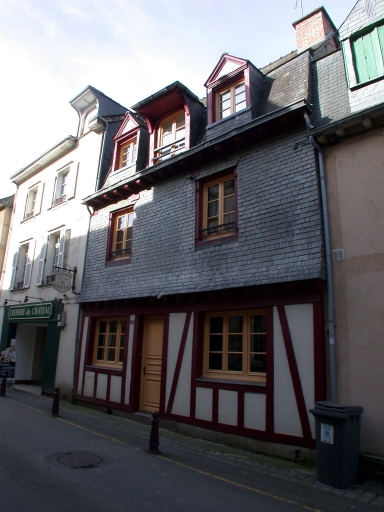 Parcelle étroite et allongée dite laniérée Adoption du mur gouttereau sur rue Etage avec léger encorbellement recouvert d'un essentage en ardoise cachant un pan de bois Toit à longs pans brisés. Lucarnes du comble avec frontons. Façade plus large à deux travées. Entrée centrée.
