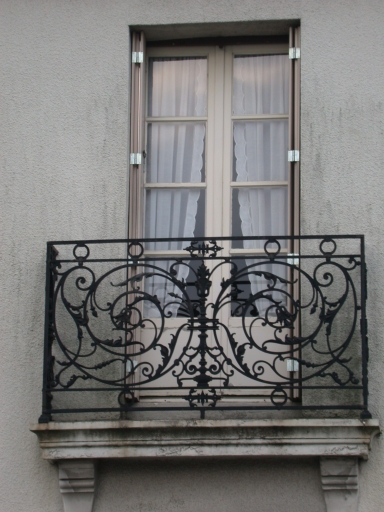 Façade recouverte d'un enduit de ciment. Balcon de l'étage avec ferronnerie ouvragée dans le style du 18e siècle avec deux grandes spirales affrontées.