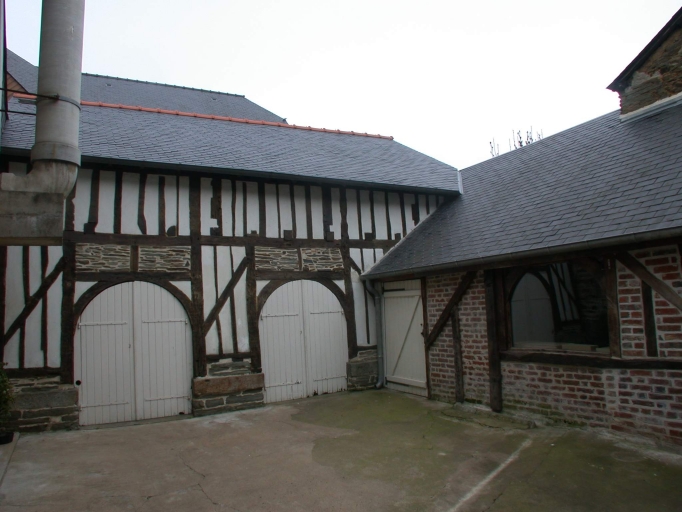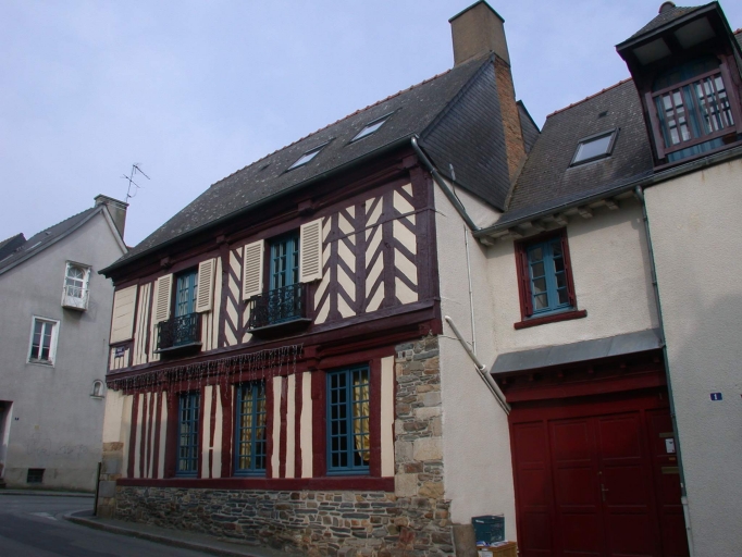 Façade rue Alexis Garnier en pan de bois. Encorbellement sur entretoises. Sablières moulurées. Partie haute du pan de bois avec décharges à chevrons.Façade en moellon de schiste rue Julien et Pierre Gourdel.