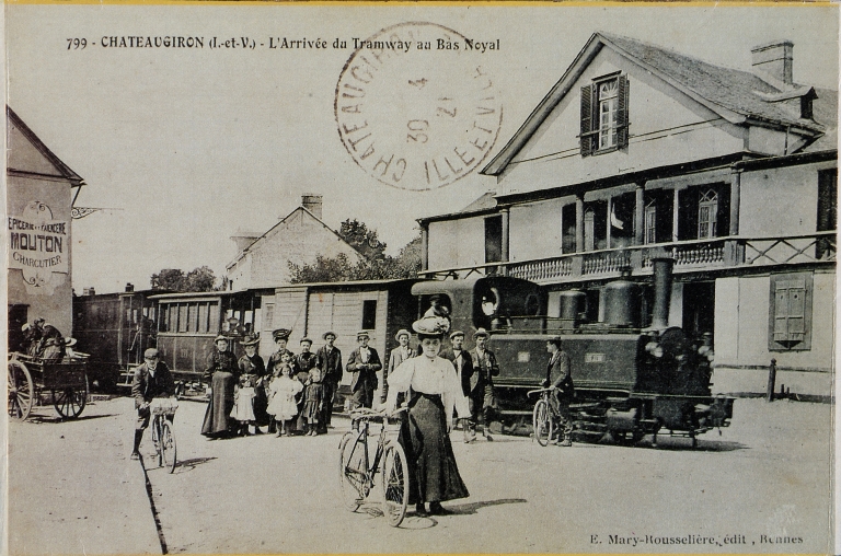 799. Châteaugiron. L'Arrivée du Tramway au Bas Noyal, carte postale, E.Mary Rousselière, éditeur, Rennes. (A.P. Jean Duroudier).
