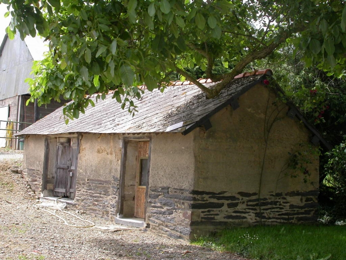 Les différents bâtiments composant cette ferme sont construits en bauge sur un solin de schiste. Ils sont couverts d'ardoise. Le bâtiment principal abrite un logis en partie centrale ; ce logis est bordé à l'ouest d'une étable et, à l'est, d'une écurie. Le pignon ouest de l'étable est percé d'une montjoie, une niche abritant une statue de la Vierge. Au sud, perpendiculairement à ce premier bâtiment, une grange est construite en bauge. Les vestiges d'un bâtiment entièrement construit en moellon de schiste subsistent au sud de la grange.