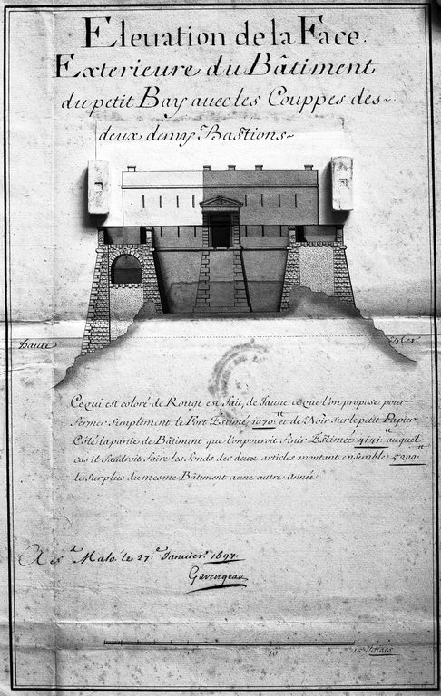 "Il manque à ce fort une petite avancée pour couvrir son entrée et fermer son fossé, faire un escalier pour y monter, un pont dormant à bascule. Dépense de 6 000 livres". Garengeau, janvier 1734.