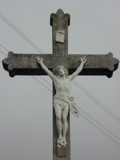 Cette croix en granite possède des bras trilobés. Elle supporte un Christ en fonte de fer peinte surmonté de l'inscription : INRI.