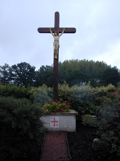 Croix en bois. Sculpture du Christ en ronde-bosse en fonte de fer polychrome. Inscription sur le socle : 1995.
