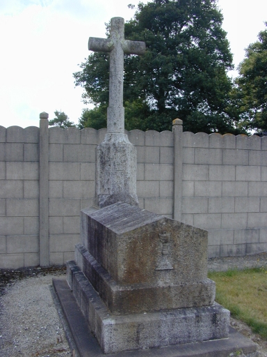 Une grande croix en granite se dresse au fond du cimetière Le fut est semblable à un chapiteau corinthien. Cette partie est écotée, c'est-à-dire qu'elle est traitée comme un arbre sec, dont les branches auraient été émondées. Les bras de la croix sont fleuronnées. Le christ est en ronde-bosse, en fonte de métal polychrome et au-dessus de sa tête se trouve l'inscription I.N.R.I. La base de la croix est surélevée et possède quatre marches. Nous pouvons y lire les inscriptions suivantes : MISSION / 1894 / MISSION / 1946. De part et d'autre se trouvent deux sculptures polychromes de la Vierge et de St Jean. Elles sont posées sur des socles en granite. Dans le cimetière se trouve également la tombe d'un Abbé, surmontée d'une croix. Sur une face du caveau en granite est sculptée un calice. La majorité des croix sont en granite.
