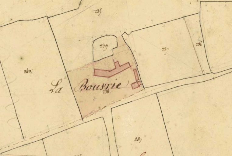 Cet ensemble formait autrefois un ancien logis-porte, c'est-à-dire qu'il fallait passer par la porte cochère pour accéder à la cour de la ferme et au logis. La cour était protégée à l'opposée par une motte. Ce logis-porte est une construction de plan rectangulaire qui regroupaient probablement des pièces d'habitation et des celliers autour du passage du rez-de-chaussée. Ce bâtiment est remarquable par son traitement : le passage central est encadré par des contreforts présentant un bel appareillage. En 1827, le logis-porte possédait une avancée en façade nord. Elle existe toujours et était vraisemblablement un logis à pièce unique, percé d'une porte en arc en plein cintre et d'une fenêtre grillée et chanfreinée. Cette maison pourrait dater de la fin du 16e siècle. Elle est aujourd'hui déclassée en dépendance agricole. En 1827, il y avait également une construction au sud, flanquée d'une dépendance latérale. Il s'agit de la maison que l'on voit aujourd'hui puisqu'elle porte la date de 1814. On notera qu'en 1827, les alentours de La Bouverie présentaient un parcellaire très large. Paul Banéat mentionne l'existence d'un ancien manoir au lieu-dit La Bouverie. Il était aux du Gesclin en 1427 et 1513.