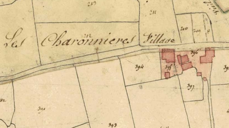 Le cadastre terminé en 1827 mentionne la présence d'une ferme composée de quatre bâtiments et d'un four au lieu-dit Les Charonnières village. Il pourrait s'agir du logis que l'on voit aujourd'hui, car il semble, en effet, dater du 17e siècle. Les dépendances sont plus récentes.