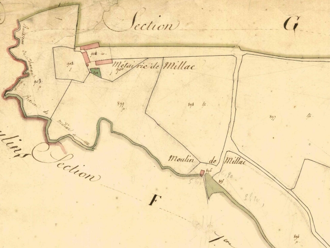 Plan géométrique parcellaire de la commune de Bais, section G3 dite de Miliac. Levée par Barbé et Chalette géomètres, [1827], échelle 1/2500e. (A.D. Ille-et-Vilaine : 3 P 5247).