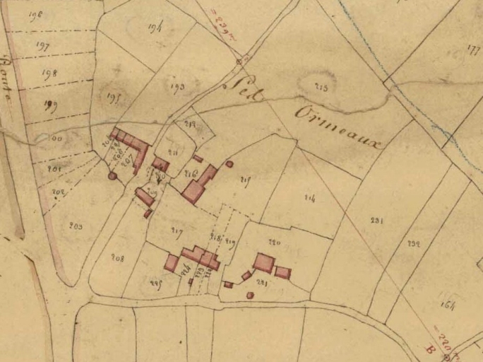 Le village des Grands Ormeaux est situé à l´est du bourg, proche du village de Mauhy. L´implantation de l´habitat se regroupe autour de voies formant une fourche. La particularité de ce hameau provient d´une longue tradition artisanale, celle des artisans vanniers. La famille Hérisset produit des paniers en ce lieu depuis cinq générations. La photo ancienne qui est ici reproduite rend compte de se savoir faire. Il n´existe pas d´atelier spécifique, ici l´artisan travaille en extérieur. Le logis est encore en place, mais il a été récemment rénové. La structure ancienne en pan de bois est néanmoins toujours visible en façade arrière (figure 3). Les percements en façade indiquent un logis à fonctions combinées (étable ou cellier jouxte la salle). D´autres logis mentionnés également sur le premier cadastre de 1827 sont encore en place, mais de nouvelles constructions sont élevées au 19e siècle comme en témoignent les dates portées de 1856 et de 1880.