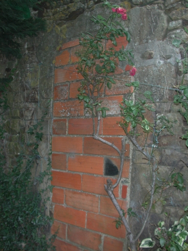 Cette ancienne maison est en grès. Une de ces entrées est bouchée. Les poutres ont un décor en forme de pointe de diamant.