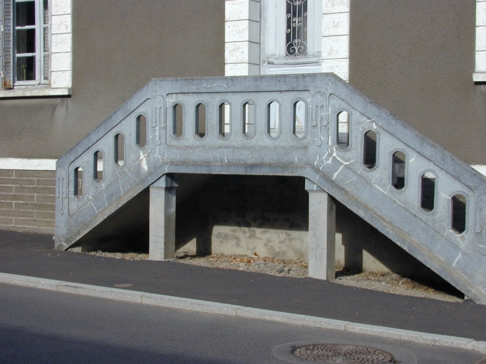 Un escalier en béton armé avec des motifs permet d'accéder à l'étage de cette maison. Les accès au grenier et à la cave se font sur le pignon.