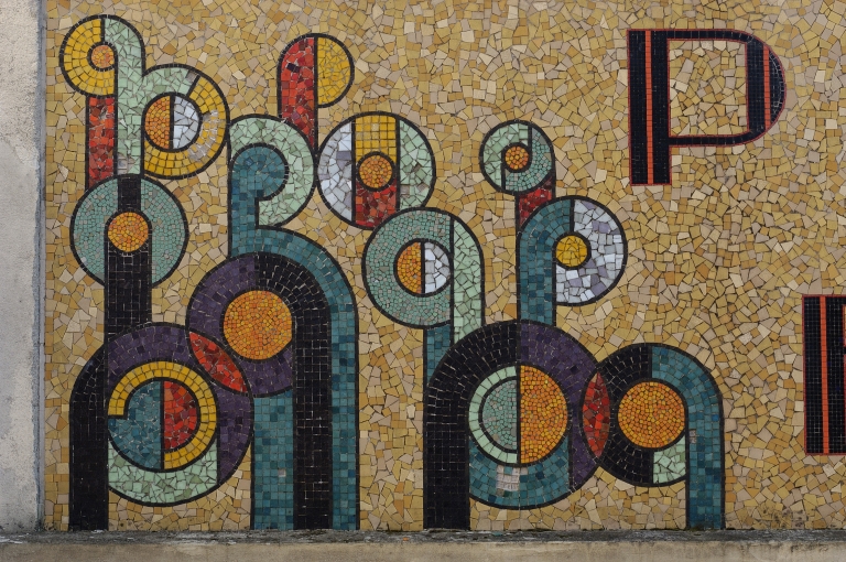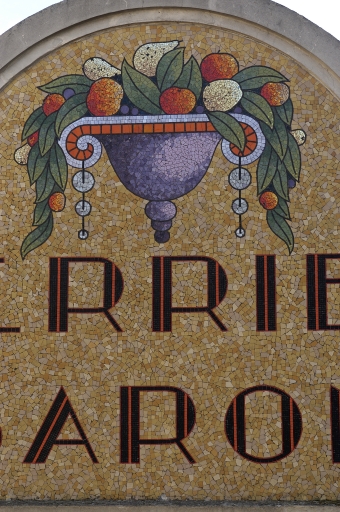 Ce bâtiment en moellon de microdiorite de quartz possède une façade en béton. Cette façade est surmontée d'un fronton semi-circulaire couvert de mosaïque d'Odorico. Cette mosaïque représente une coupe de fruits, des motifs géométriques et le nom des propriétaires : PERRIER/BARON.