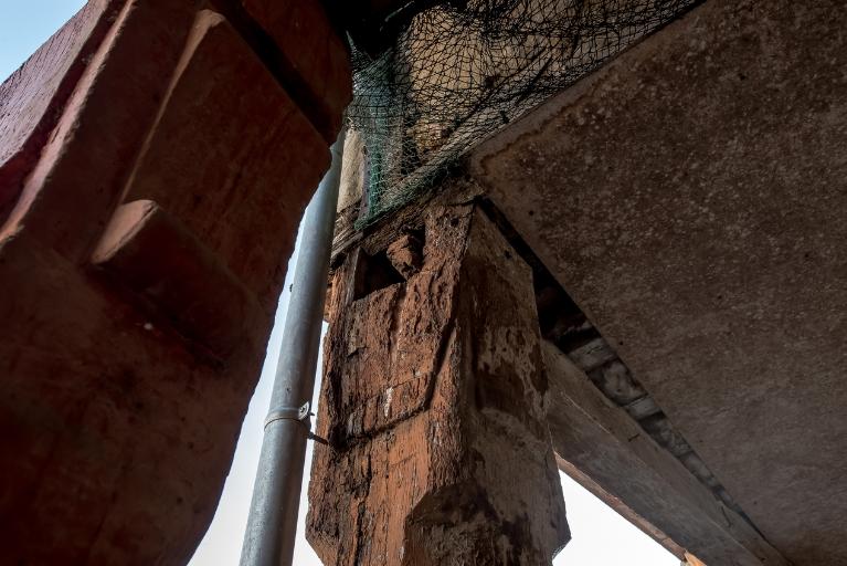 L'assemblage est comparable au porche voisin (n°10, rue d'Anjou) : les poteaux à tête élargie supporte une sablière basse, qui reçoit les solives. La sablière haute est en léger surplomb.