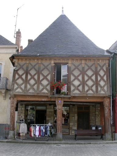Maison à porche à deux travées, dont le pignon donne sur la place des halles. La façade a été recouverte dans les années 1920 d'un enduit ciment imitant un pan de bois en croisillons face à la place et des poteaux verticaux sur les faces latérales. Les têtes de poteaux sont décorées d'écus lisses et d'éléments imités de l'architecture antique sur leurs quatre faces sauf le poteau cornier est. Le porche a une profondeur de 2m40 environ et un écart entre poteaux de 3m.