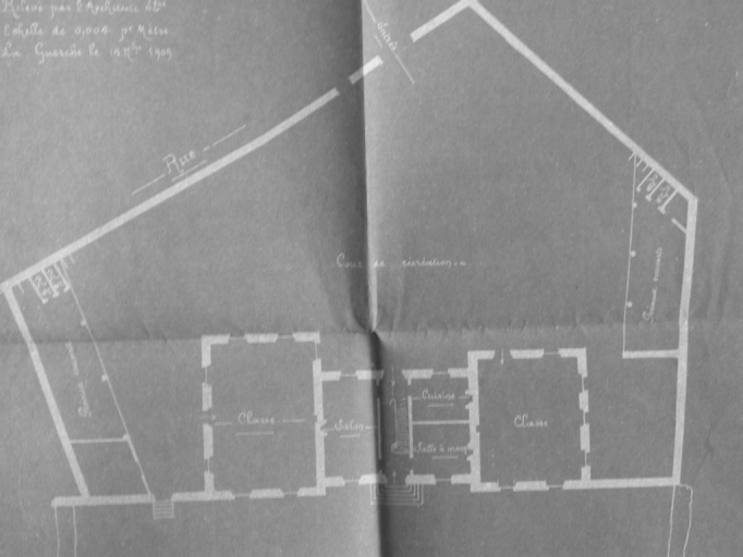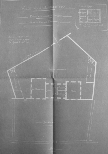 La réalisation de ce bâtiment remonte à la limite du 19e et du 20e siècle. Il existe des plans de ce bâtiment qui ont été réalisés en 1909. Ils nous permettent de savoir que ce bâtiment était l'ancienne école de garçons de la ville de la Guerche-de-Bretagne. La cour donnant actuellement sur la rue de la Chartre était en réalité la cour de récréation de l'école. Le bâtiment central couvert d'un comble à la Mansart abritait le logement de l'instituteur. Ce logement possédait un escalier central desservant l'étage. A l'ouest de l'escalier, se trouvait le salon et à l'est, la cuisine et la salle à manger. L'étage était composé de quatre chambres et d'un débarras. Les salles de classe se trouvaient dans les deux bâtiments accolés au bâtiment central. Aujourd'hui, au sud-ouest de la cour, il existe d'autres bâtiments, ceux-ci ont été construits par la suite car l'ensemble avait été acheté par un marchand de grains. Ces bâtiments servaient donc d'entrepôts. En effet, dans les archives, il est mentionné que l'immeuble de l'ancienne école de garçons avait été vendu à un certain M. Hervouin en 1914. Ce bâtiment a donc abrité l'école publique de garçons au 19e siècle et jusqu'à 1907, date à laquelle elle fut transférée avenue de la République.