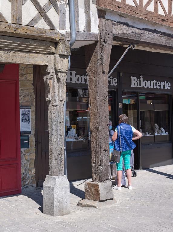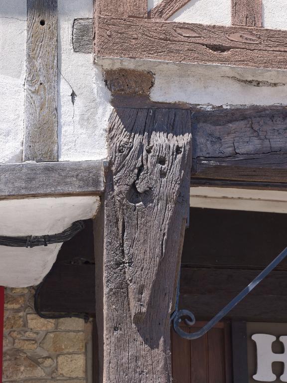 Maison d'angle à pignon sur la place des halles. Le porche est plus haut que celui du n°4 voisin. Il a une profondeur de 1m90 environ pour une hauteur de 3m15. L'écart entre le poteau cornier gauche - seul poteau d'origine - et le poteau central est de 3m20, pour 2m40 du poteau central au poteau cornier droit. Le poteau d'origine porte un décor triangulaire simple.