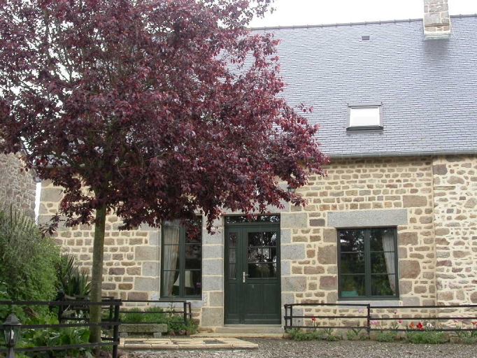 Ce bâtiment est élevé en moellon de granite, la toiture à longs pans est couverte d'ardoise. Les encadrements des baies sont en pierre de taille de granite ; la façade nord a conservé des encadrements anciens : linteaux chanfreinés, porte en plein cintre... alors que la façade sud possède des encadrements plus réguliers. Au sud-est, se trouvent des porcheries dont la façade emploie un appareillage décoratif en moellon à tête dressée. Le fournil situé au sud-est est construit en bauge sur un solin de pierre.