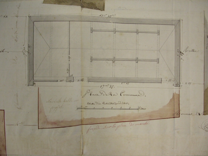 Le marché se tenait le mercredi sous la halle seigneuriale qui était située au nord de la mairie actuelle. Cette ancienne halle mesurait environ 17 mètres de long sur 7, 6 mètres de large. Des plans de cette ancienne halle sont conservés aux archives départementales d'Ille-et-Vilaine ; ils ont été levés par l'architecte Pointeau. L'ancienne halle datait peut-être du 16e ou du 17e siècle. Elle a été remplacée en 1845 par le bâtiment de la mairie actuelle qui abritait originellement la mairie, l'école et la halle de la commune.