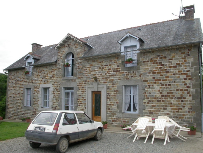 Ce logis de ferme est construit en pierre de taille de grès et couvert d'ardoise. Les baies présentent des encadrements de granite. Le comble à surcroît est percé de deux portes hautes pendantes en bois latérales et d'une porte haute centrale plus développée, en pierre, qui est percée d'une ouverture en plein cintre. Il existe une cheminée sur chacun des pignons de la construction.