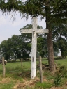 Cette croix en bois porte un Christ en fonte peint. Les extrémités de la hampe et des bras de la croix sont moulurés.