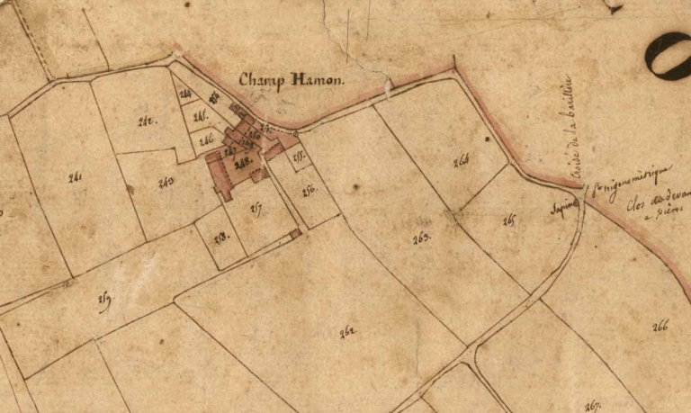 En 1828, lors de la réalisation du premier cadastre de la commune, cet écart était composé d'un alignement de trois logis au nord et d'un bâtiment plus important au sud-ouest. Ce bâtiment correspondait peut-être à l'ancien manoir du Champ Hamon. Ce manoir appartenait aux Milon au début du 16e siècle.