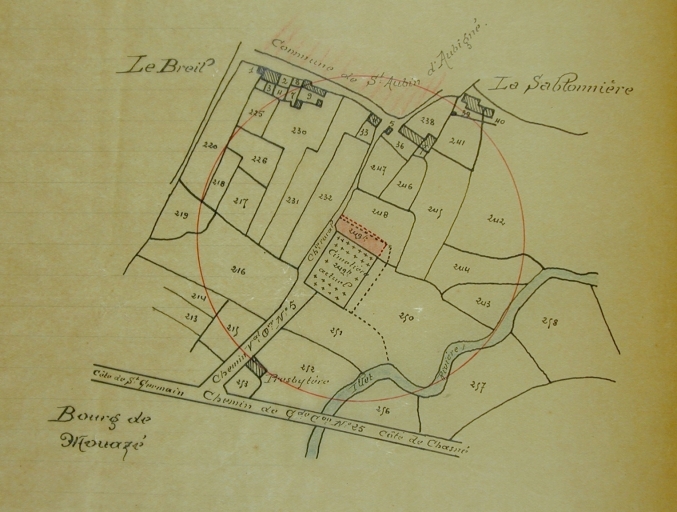 A. D. Ille-et-Vilaine. Série 0 : édifices publics - monuments et établissements publics. Cimetière. Plan parcellaire des environs du bourg de Mouazé et du terrain à acquérir pour l'établissement d'un nouveau cimetière.. 23 février 1866. (A. D. Ille-et-Vilaine : 2 O 198/19).