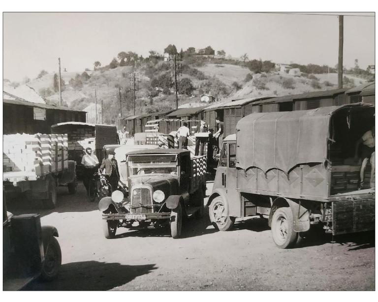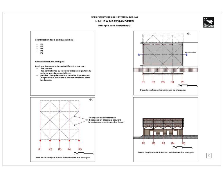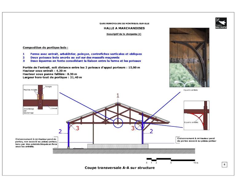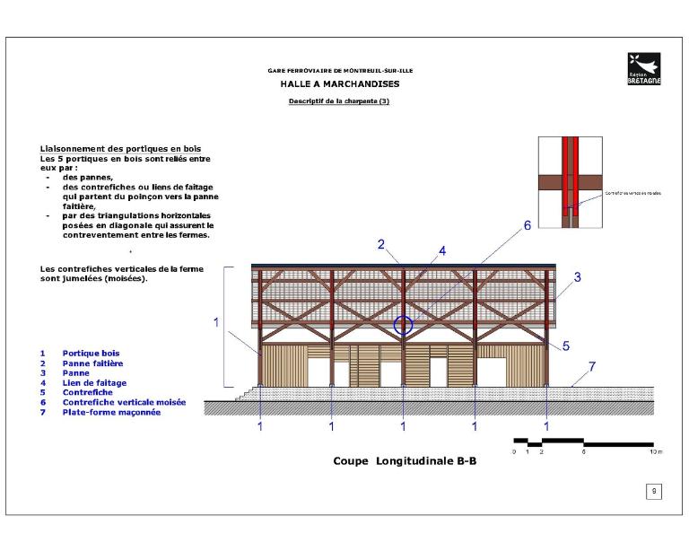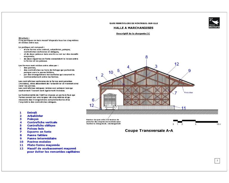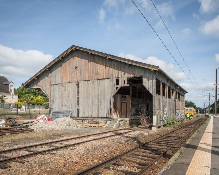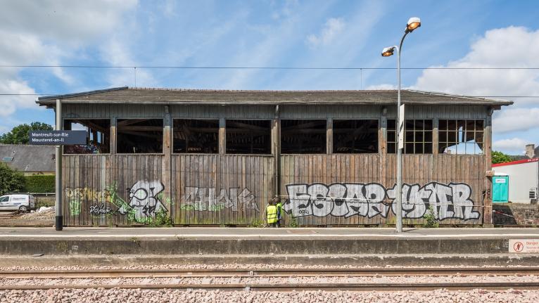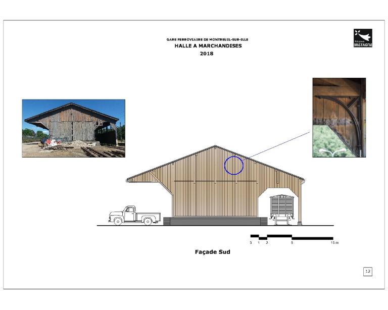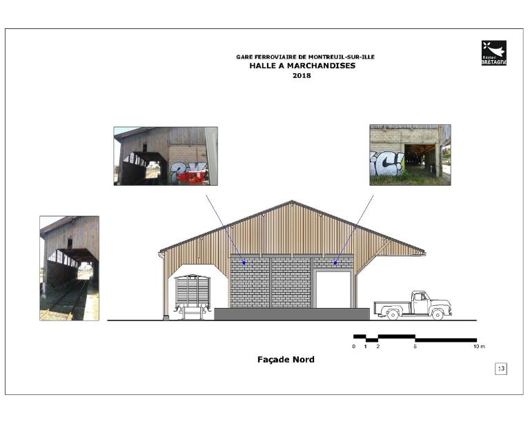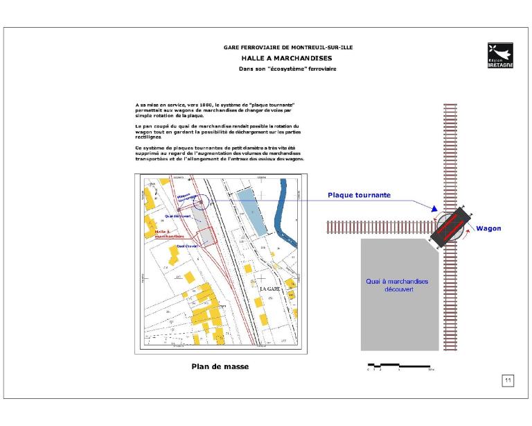 La halle à marchandises semble avoir été construite postérieurement (années 1880 ?). Elle répond également aux dessins des halles marchandises de la Compagnie de l’Ouest. En 1832, l’ouverture du canal d’Ille-et-Rance avait dynamisé l’économie des communes qu’il traversait. A Montreuil, des activités de tannerie, laiterie et marbrerie s’installent. Les chalands transportaient principalement du bois, du sable, des pommes, des ardoises, de l’engrais et des produits chimiques Elles profitent de l’arrivée du chemin de fer pour se développer. La fabrication de monuments funéraires bénéficie notamment des facilités d’acheminement par le rail des lourds blocs de pierre.