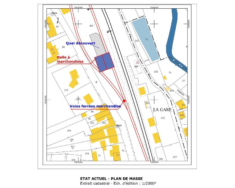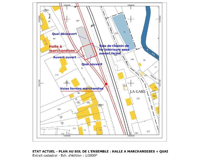 A l’est, une voie ferroviaire sous auvent fermé permettait de charger/décharger les wagons ; à l’ouest le quai permettait le chargement/déchargement des charettes ou camions. Le quai se poursuit au nord du bâtiment et permettait des manutentions équivalentes en plein air, sans doute facilitées par une grue (aujourd’hui disparue) sur l’angle à pan coupé du quai (nord-est).