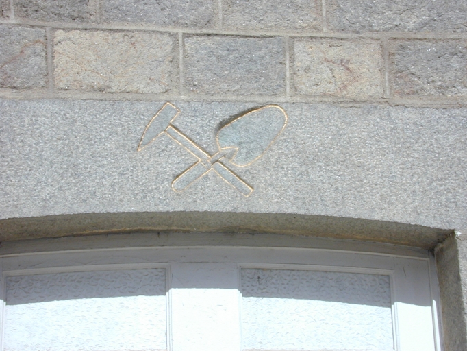 L'inscription Jean Loret 1860-1939, une pelle et un marteau sont visibles au-dessus des portes.