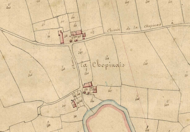 Commune de Chevaigné. Section B dite du bourg, en trois feuilles, dernière. Par Mr Cheval fils [1828], échelle 1/2500 e. (A.D. Ille-et-Vilaine) 7.
