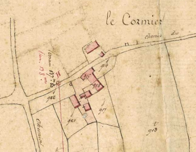 En observant le cadastre napoléonien levé en 1828, nous pouvons constater que le débarras dans l'alignement du logis était une ancienne ferme. Le pressoir était également un logis (le pignon a été remonté). Les bâtiments mentionnés sur ce document du début du 19e siècle sont ceux que nous voyons aujourd'hui. En effet, cette ferme fut construite au 17e siècle. Plusieurs éléments permettent de la dater ainsi : le fort coyau de la toiture et les corbelets sculptés. Il s'agit probablement d'une ancienne construction en pan de bois remontée en bauge par la suite.