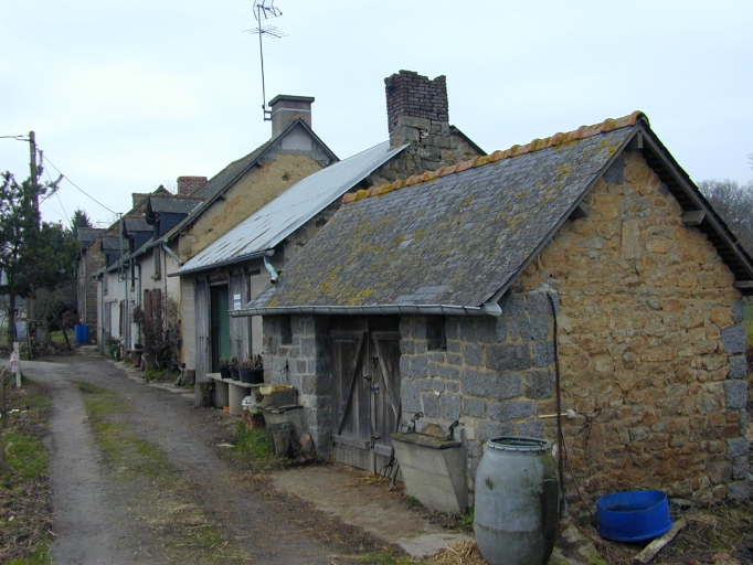 Cet alignement enduit est construit en terre et est couvert d'ardoise. Une laiterie et un fournil s'élèvent de part et d'autre des pignons, un appentis postérieur abrite un cellier. La soue à cochons se situe au nord.