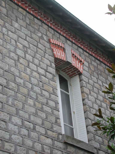 Cette maison présente un appareillage de granite et est couverte d'un toit à croupes en ardoise. La façade principale est percée de trois travées de baies. Les linteaux des ouvertures sont en brique et les clefs en granite.