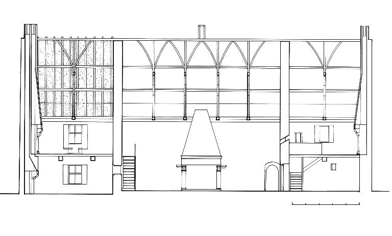 Cet ancien logis seigneuriale du début du 15e siècle, bien que d'aspect dénaturé, en particulier dans sa partie est, surhaussé de deux étages au 17e siècle, a cependant conservé une bonne partie de sa distribution d'origine ; cellier et chambre seigneuriale au-dessus à l'ouest, volume de l'ancienne salle basse sous charpente et cuisine à l'est avec passe-plat et surtout sur les deux-tiers du logis une charpente d'origine d'exceptionnelle qualité. Cette charpente présente encore quatre fermes moulurées à liens courbes, au-dessus de l'ancienne salle du manoir actuellement recoupé par un plafond. Les arbalétrées et liens courbes de cette charpente sont soigneusement moulurés de même que les entraits, les sablières et les entretoises. A sa base, des jambettes reliant les entretoises aux chevrons ont conservé leur hourdis de terre d'origine. La présence de plusieurs vestiges de l'ancienne distribution intervenue a permis d'induire une coupe longitudinale restituant l'état supposé du manoir au 15e siècle. Dans le mur de refends ouest de la salle deux portes d'origine l'une sensiblement plus large que l'autre correspondent au cellier, la plus étroite devait ouvrir sur un escalier, inscrit dans une cage en bois et conduisant au-dessus du cellier à la chambre seigneuriale. Cette dernière a d'ailleurs conservé sa charnière d'origine, ses fenêtres et son judas permettant de regarder en contrebas dans la salle. Dans cette pièce, la proportion de l'ancienne cheminée sur gouttereau ont été restituées d'après des vestiges en place. A droite de la salle sur la coupe, l'escalier droit ainsi que la deuxième chambre haute sont également des hypothèses de restitution. Dans cette partie de l'édifice seule la cuisine a conservé ses dispositions d'origine avec vaste cheminée à foyer concave, fenêtre sur cour et sur jardin logement ébrasées et passe-plat.