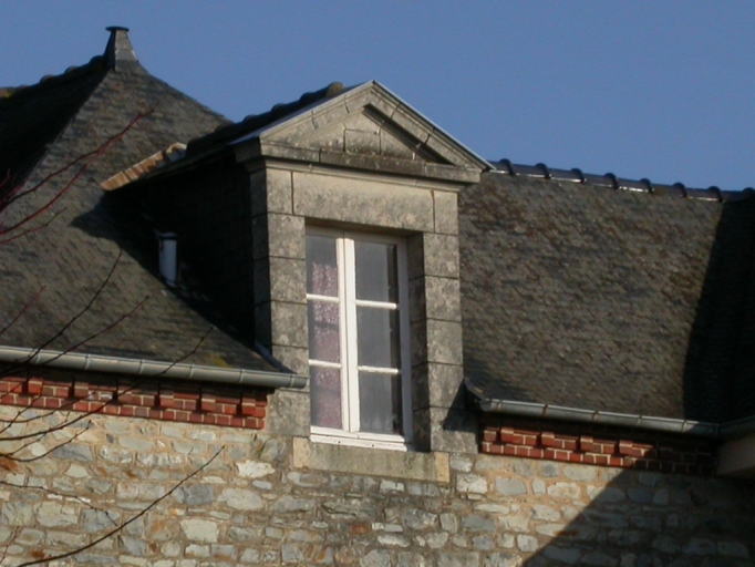 Bâtiment construit en grès. Corniche et encadrements des ouvertures en brique, linteau en granite. Toit à croupe avec épis de faîtage en ardoise.