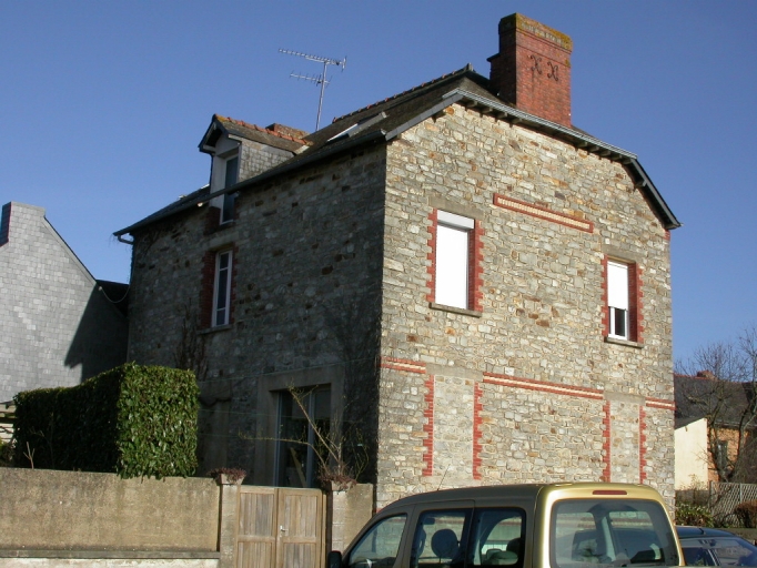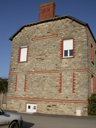 Maison construite en grès avec des encadrements en brique et linteau en ciment. Toit à demi-croupe.