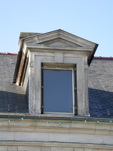 Maison construite principalement en grès, façade en pierre calcaire. Lucarnes à fronton triangulaire.