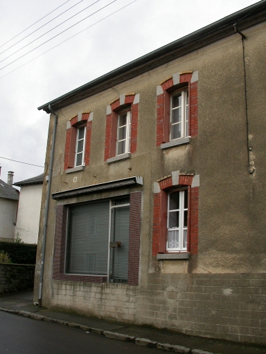 Maison en terre recouverte d'un enduit décoré d'un bandeau peint. Encadrements en brique avec clés et appuis en granite.