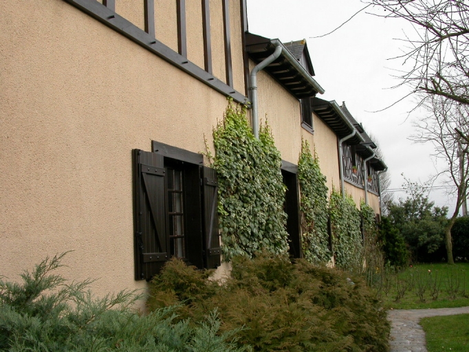 Maison construite en terre et en pan de bois, recouverte d'un enduit.