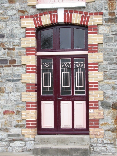 Maison construite en pierre avec encadrements en brique polychrome. Toit à croupe avec épis de faîtage en céramique.