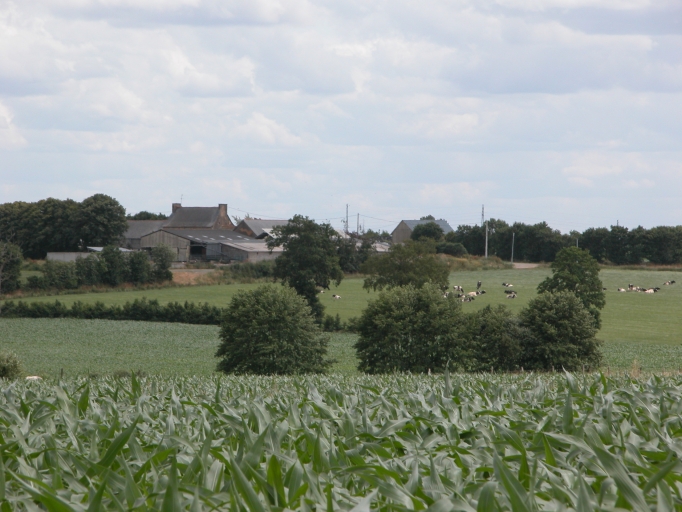 L'ancienne maison de notable date vraisemblablement du milieu du 18e siècle ainsi que l'attestent la composition à travées de la façade ou, par exemple, le remarquable travail de menuiserie réalisé lors de la fabrication d'une cage d'escalier intégrant une horloge ou encore le lambris de couvrement qui habille l'ensemble des murs d'une salle en rez-de-chaussée. Ainsi le logis de cette exploitation rurale appartenait certainement à un commanditaire relevant de la notabilité locale. [Le blason au dessus de la porte d'une annexe n'est cependant pas identifié]. Des parties agricoles en terre furent ajoutées au 19e siècle ; d'autres furent détruites récemment au sud et à l'est de la cour.