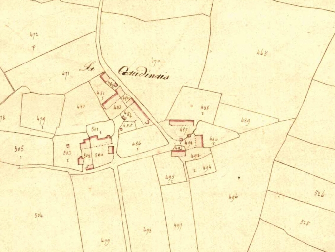Plan géométrique parcellaire de la commune de Saint-Aubin-d'Aubigné, section D1 dite du Chêne Romé, levée par Roger géomètre, [1828], échelle 1/2500e (A. D. d'Ille-et-Vilaine : 3P 5475).